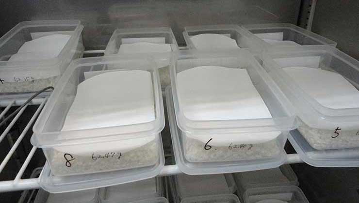 製麹の様子:蒸した米とコウジカビの胞子を混ぜたものを個別容器に入れて培養する